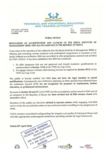 TVETA revokes Kenya Institute of Management’s accreditation with immediate effect, rendering 100,000 diplomas and certificates issued since 2018 legally invalid and unemployable