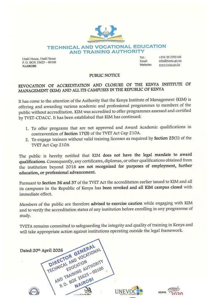 In a sweeping public notice dated April 20, 2026, TVETA Director-General Timothy Nyongesa announced the immediate revocation of KIM’s accreditation under Sections 36 and 37 of the TVET Act Cap 210A, declaring that any diplomas, certificates or professional qualifications the institution issued from 2018 onwards carry no legal weight and will not be recognised for purposes of employment, further education or professional advancement.