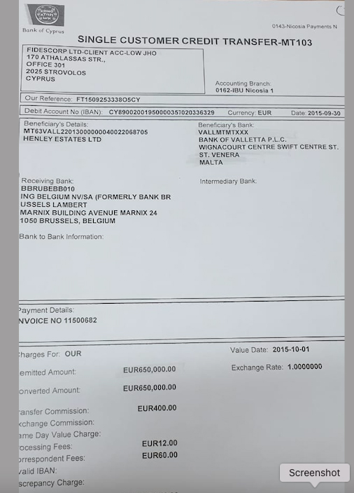 However, OCCRP has found that this is incorrect. According to a transfer receipt obtained by reporters, Low himself paid the 650,000-euro fee directly to Henley Estates, from the account in Cyprus set up for him by FidesCorp.