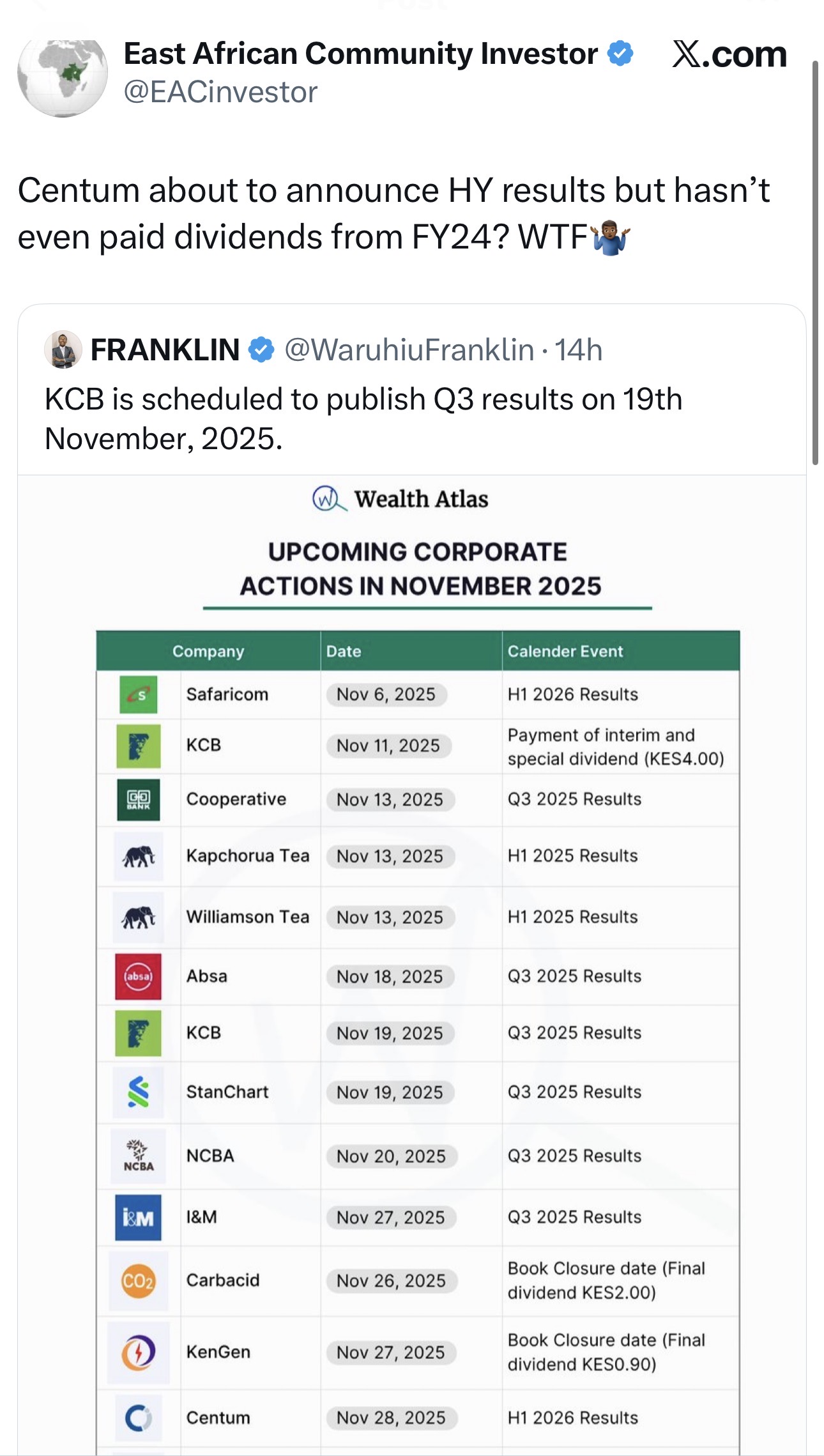 Nairobi, November 6, 2025 – Centum Investment Company Plc has come under fire from some investors for proceeding with its scheduled announcement of half-year results for the financial year ending March 2026, even as the payment of dividends declared for the previous fiscal year remains outstanding.