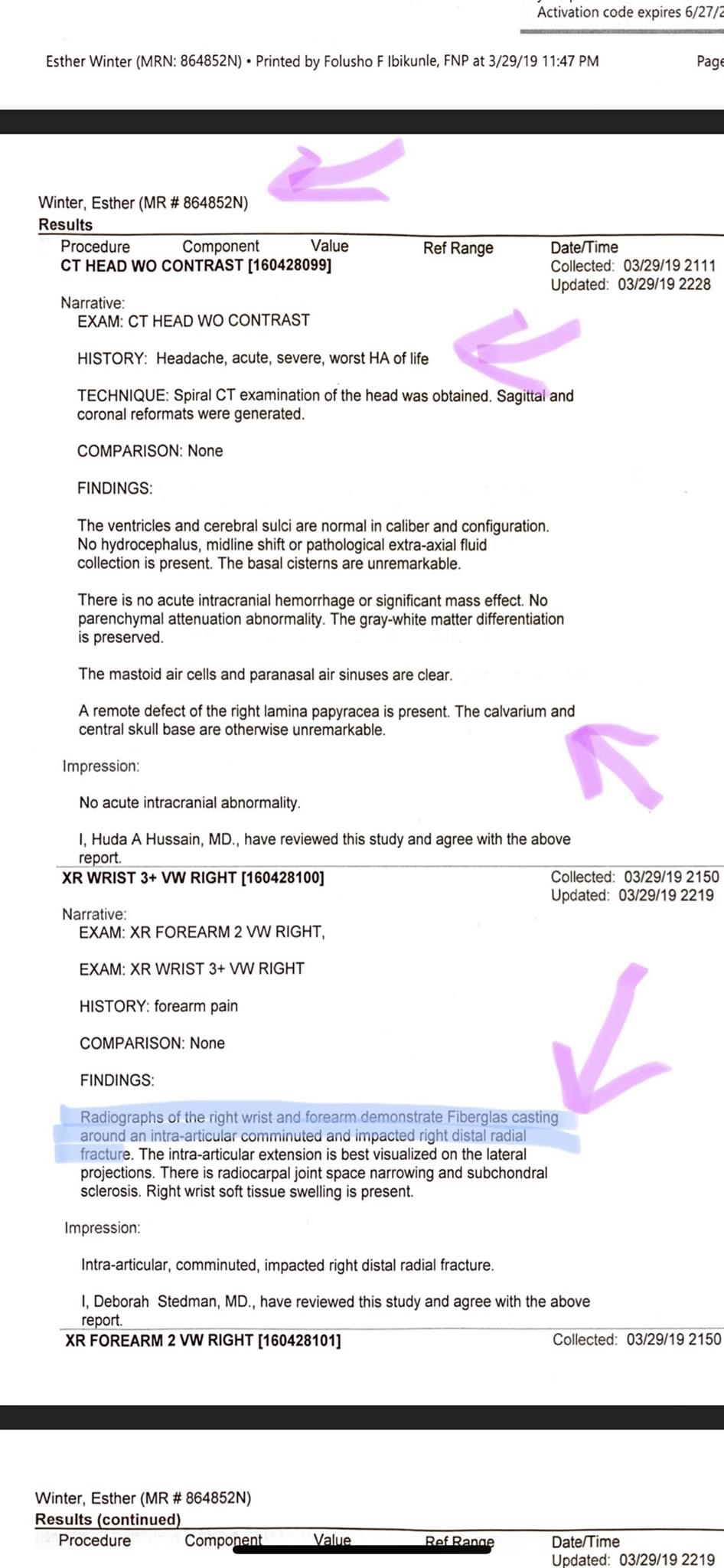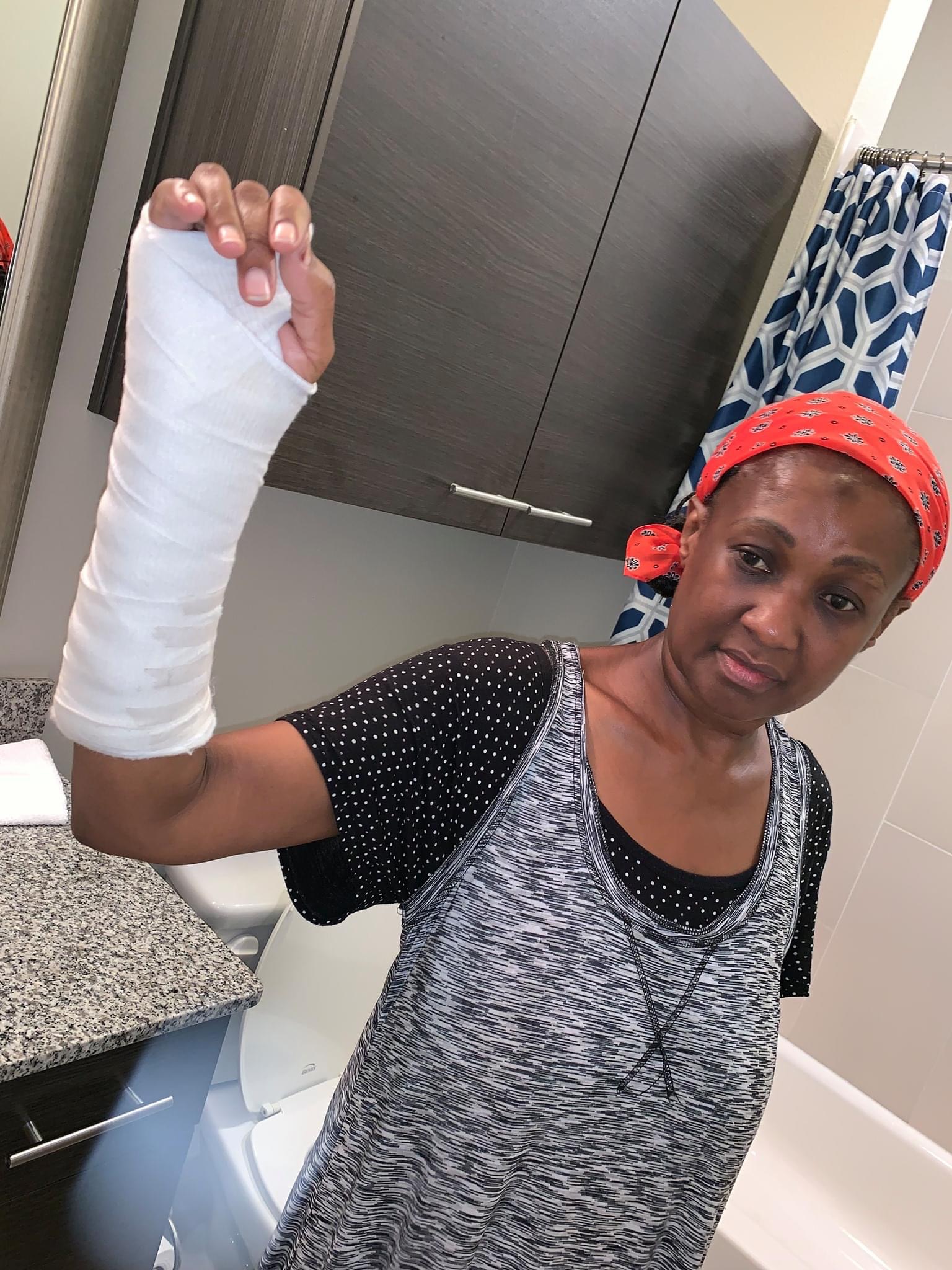 - Esther with injuries from Patrick’s assault.