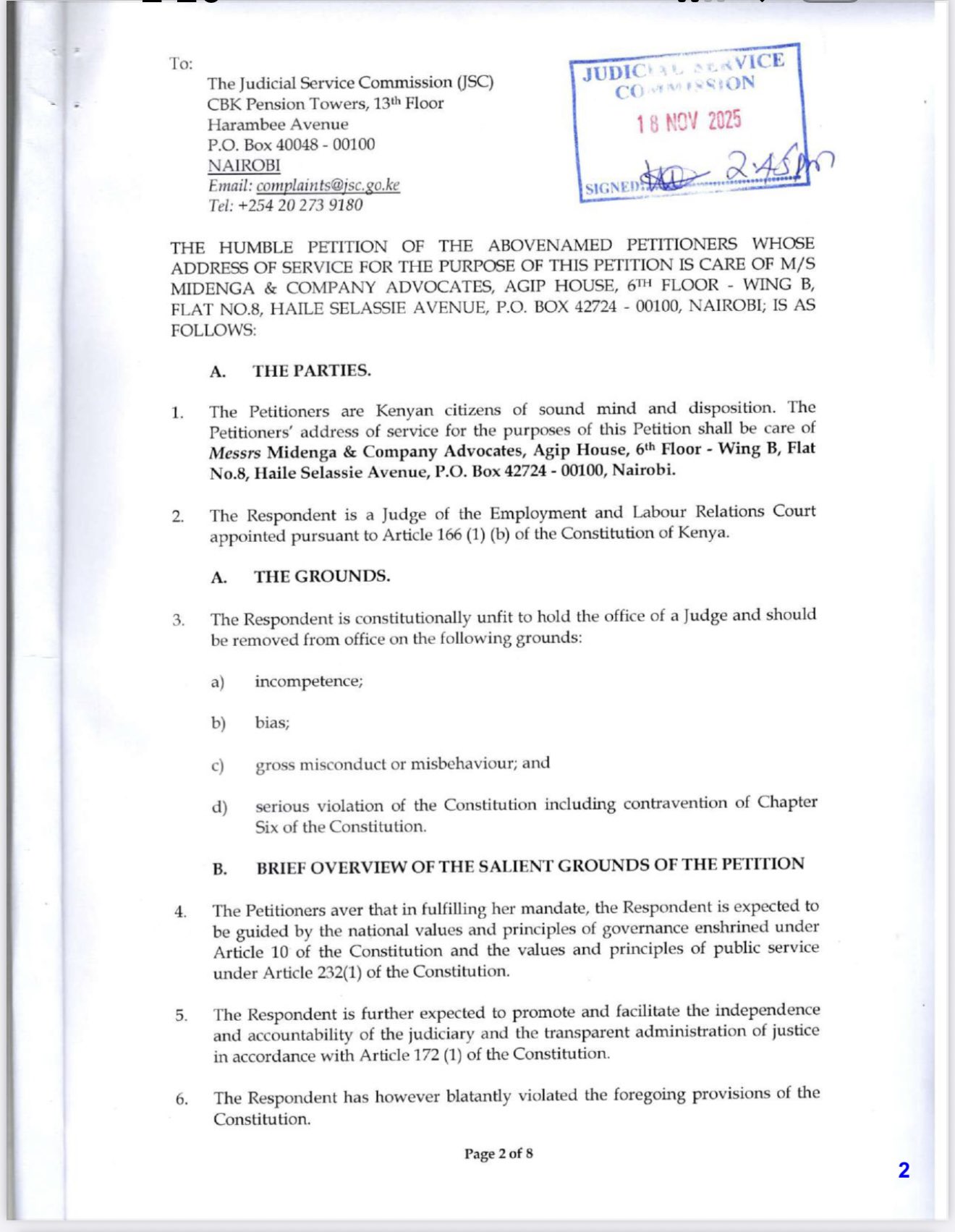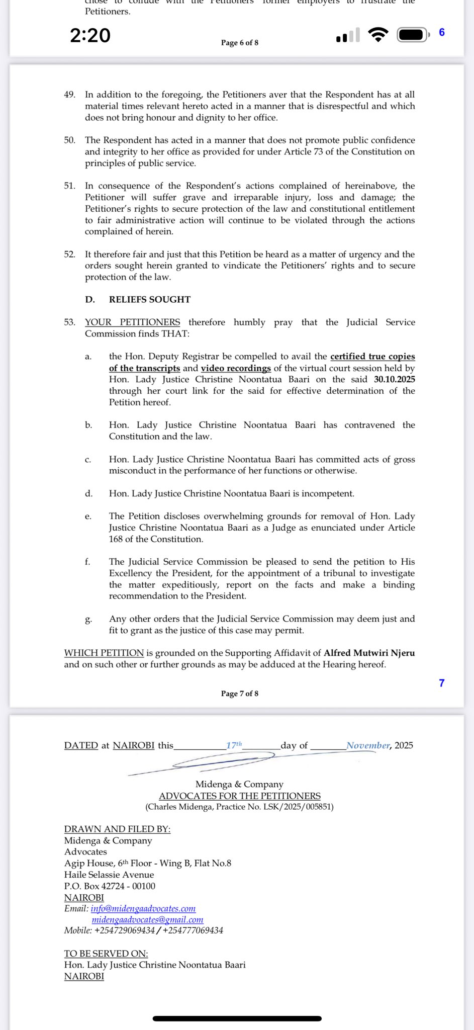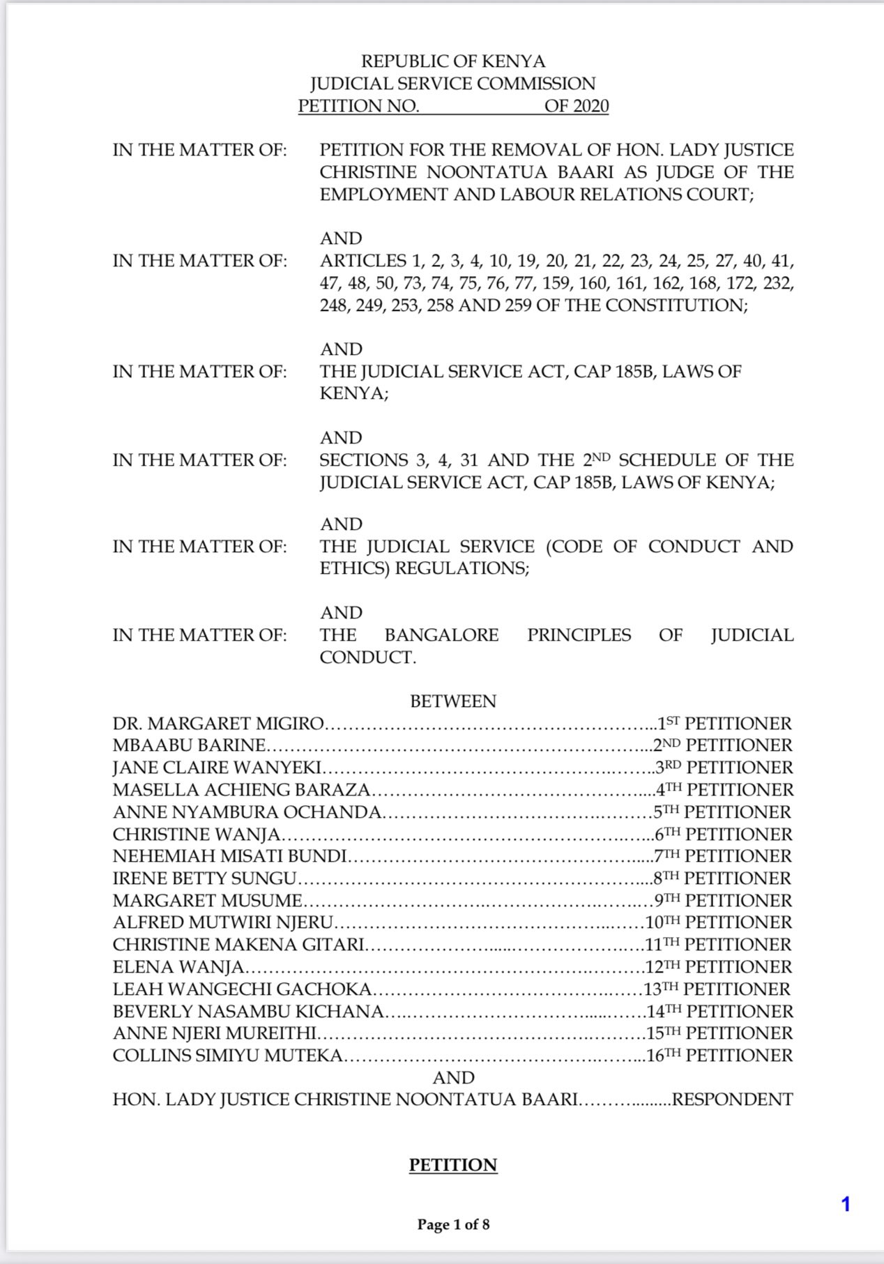 The petition, dated November 17, 2025, and stamped as received by the JSC on November 18, 2025, accuses Justice Baari of incompetence, bias, gross misconduct, and serious violations of the Constitution in her handling of a high-profile redundancy case. The petitioners, led by Dr. Margaret Migiro and represented by Midenga & Company Advocates, argue that the judge’s conduct undermines public confidence in the judiciary and contravenes Chapter Six of the Constitution on leadership and integrity.