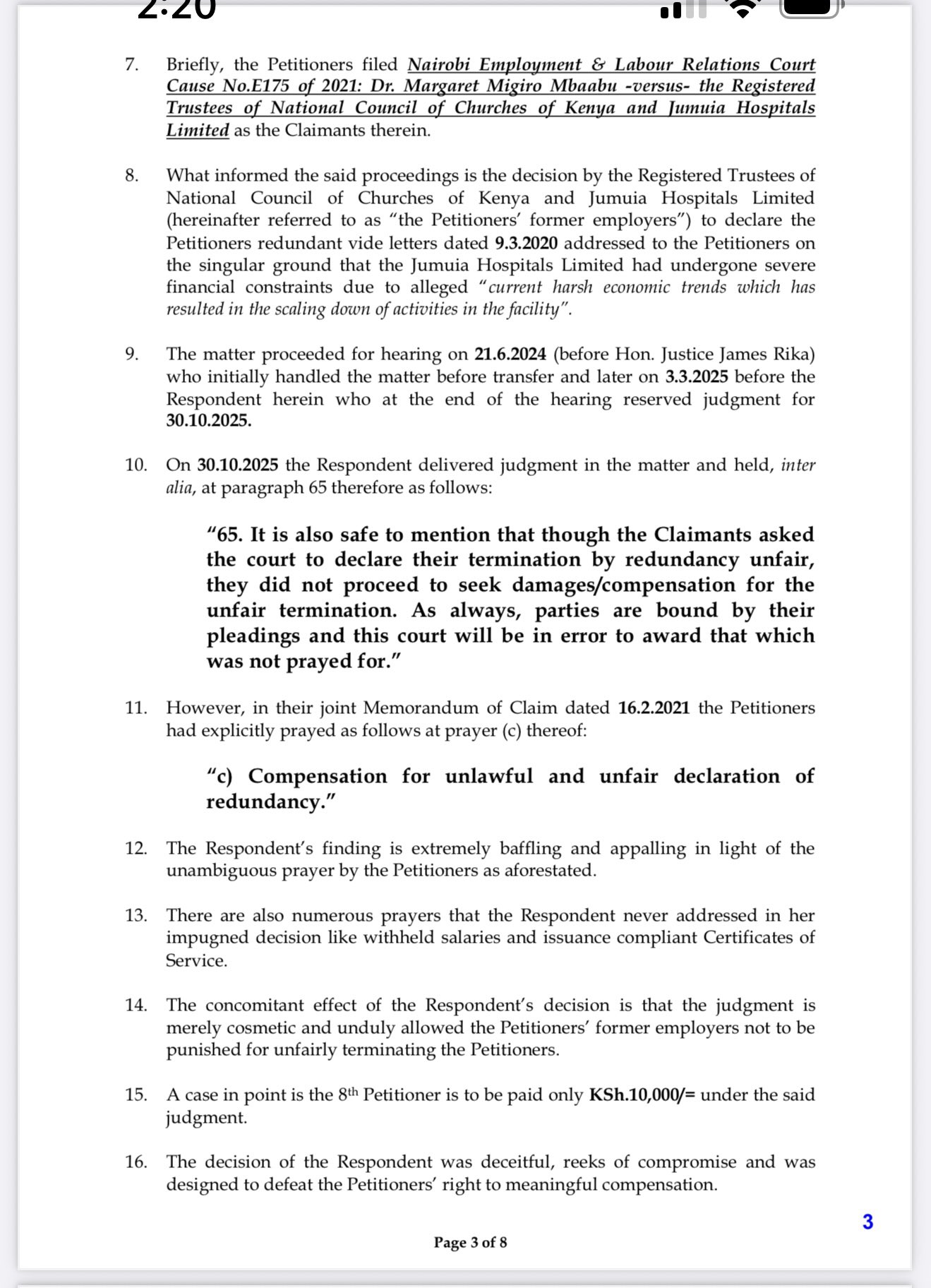 At the heart of the complaint is ELRC Cause No. E175 of 2021: Dr. Margaret Migiro Mbaabu & 15 Others v Registered Trustees of the National Council of Churches of Kenya & Jumuia Hospitals Limited. The claimants, declared redundant in 2020 amid financial constraints at Jumuia Hospitals, challenged the termination as unfair and unlawful. They explicitly sought compensation for unlawful and unfair declaration of redundancy in their 2021 Memorandum of Claim.