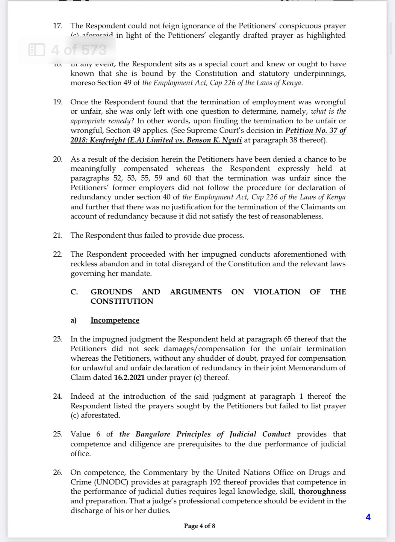 The petitioners describe this finding as “extremely baffling and appalling,” insisting that their prayer for compensation was unambiguous and that the judge deliberately ignored it to produce a “cosmetic” outcome that shielded the NCCK from accountability. They further allege that Justice Baari overlooked other unaddressed prayers, such as withheld salaries and issuance of certificates of service, and failed to apply Section 49 of the Employment Act, which mandates compensation for wrongful or unfair termination.