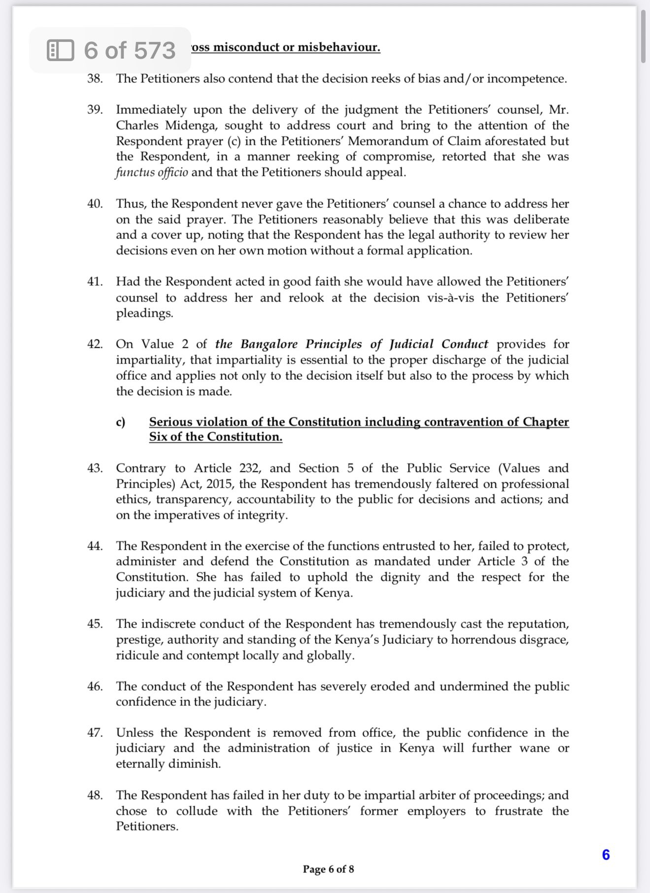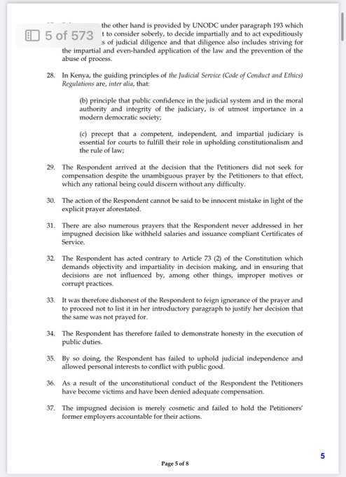 Additional grounds include claims that the judge showed bias by refusing to allow the claimants’ counsel to address the court immediately after judgment delivery, instead suggesting an appeal—a move the petitioners say reeks of compromise and an attempt to cover up flaws in the ruling. They contend that her actions eroded judicial independence, contravened Article 73(2) on objectivity and impartiality, and violated the Bangalore Principles of Judicial Conduct.