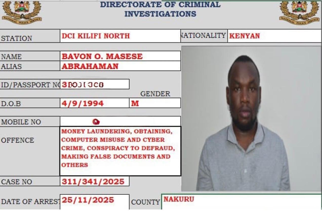 Detectives have arrested a suspected cryptocurrency fraudster accused of orchestrating a string of online scams that left victims across the country counting heavy losses. The suspect, Bavon Onyancha Masese, was tracked down and arrested in the Kiamunyi area of Nakuru after a detailed investigation led by Kilifi North Directorate of Criminal Investigations officers.