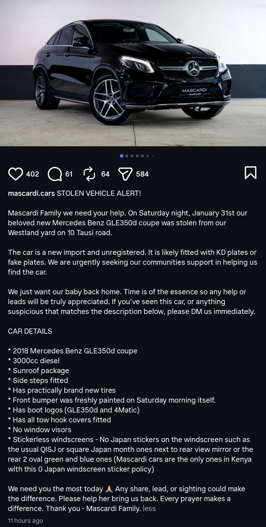 The sleek Mercedes-Benz GLK350d disappeared without a trace from Mascardi Cars in Spring Valley garage where it had been booked for a routine paint job, triggering alarm bells within days.