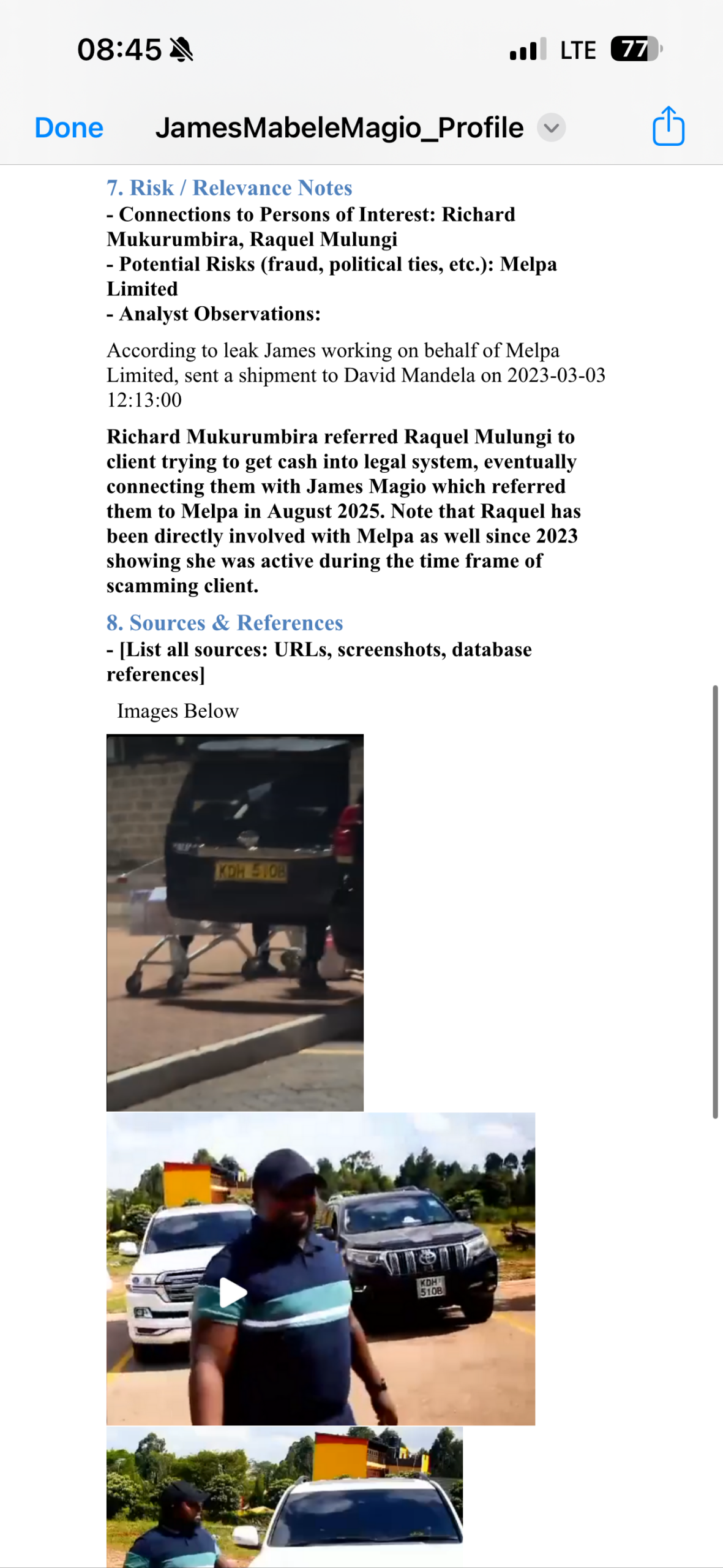 According to the leaked material, which includes a profile document dated with references to transactions from 2023, Mukurumbira allegedly referred Mungli to a client attempting to legitimize illicit funds, eventually connecting them with Magio who in turn directed them to Melpa in August of last year.