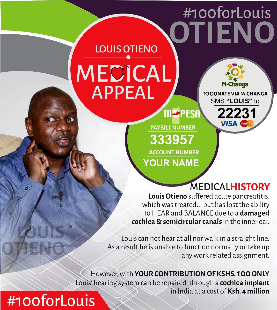 Life gives us second chances it’s how you use it that matters. It is my submission that we help Louis get his hearing back. This is also an opportunity to talk about the state of healthcare in Kenya. This is the time for on the fence celebrities to come out of rhis comfort zones and join us in the fight for universal healthcare. We need systems where Louis won’t have to worry about going to India but walking into a public hospital in Kawangware and get the exact treatment he’d have gotten at Nairobi Hospital. We need a working healthcare system that will provide quality care to both the rich and poor. If we don’t, we will continue having medical fundraisers because you know what my mum tells me? Sickness doesn’t knock, you might be well today and tomorrow you’re in unimaginable state.