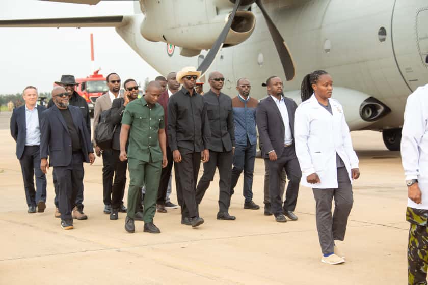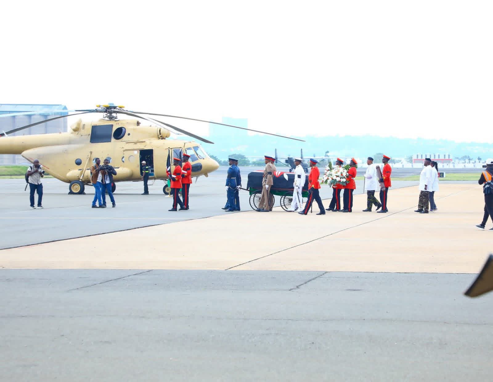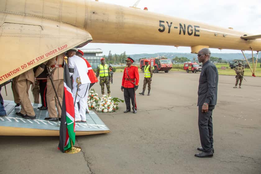 Moments later, uniformed Kenya Defence Forces (KDF) pallbearers, marching in slow precision, transferred the casket—draped in the national flag—from the aircraft to a waiting military hearse as the KDF band played the solemn tune of Abide With Me.