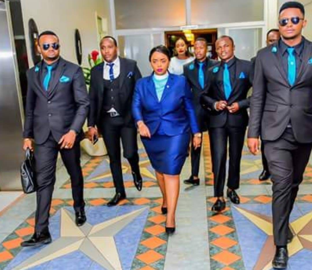Her fleet comes complete with chase cars and police escort talk about presidential standards. Her security detail entails young buffed men who by design, dress in the theme of the day.