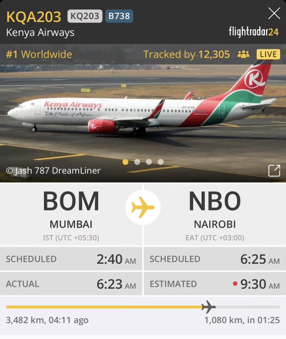 The aircraft departed Mumbai’s Chhatrapati Shivaji International Airport at 6:23 a.m. Kenyan time and is expected to touch down at Jomo Kenyatta International Airport at 9:30 a.m.