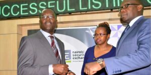 From left-Real People Chief Executive Officer Daniel Ohonde, board member Nthenya Mule and Nairobi Securities Exchange chief executive officer Geoffrey Odundo during the bell ringing to mark the start of Real People bond trading at the Nairobi bourse on August 19, 2015.