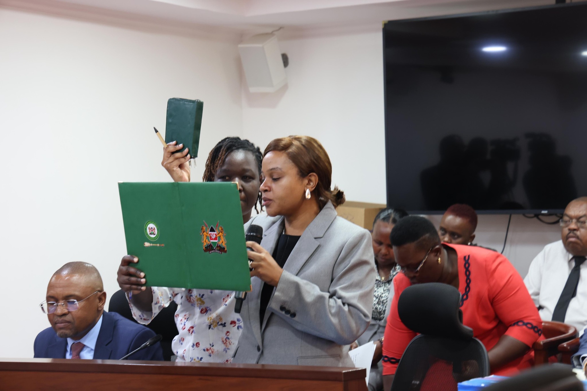 SHA CEO Dr Mercy Mwangangi takes oath before being questioned by MPs over unsupported board payments and irregular legal fees, October 22, 2025. /PARLIAMENT
