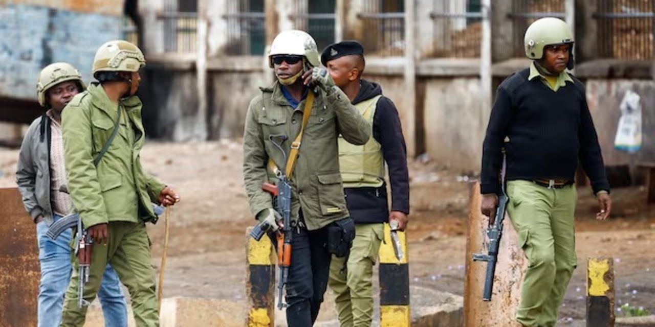 Tanzanian riot police officers walk, following a protest a day after a general election marred by violent demonstrations over the exclusion of two leading opposition candidates at the Namanga One-Post Border crossing point between Kenya and Tanzania, October 30, 2025.