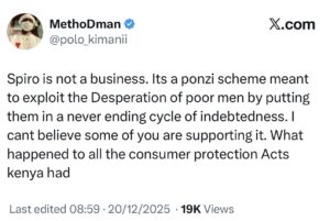 Consumer advocates have called for regulatory oversight, urging bodies like the Competition Authority of Kenya and the Consumer Protection Authority to investigate Spiro’s practices.