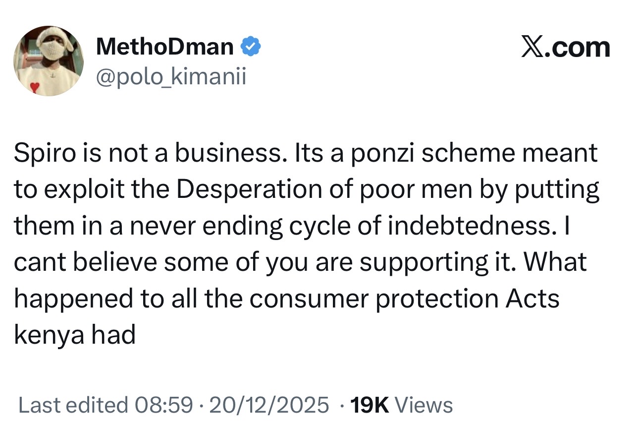 Consumer advocates have called for regulatory oversight, urging bodies like the Competition Authority of Kenya and the Consumer Protection Authority to investigate Spiro’s practices.