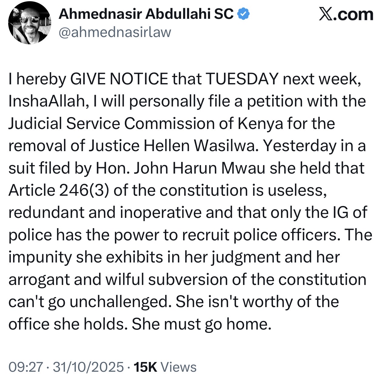 “Justice Wasilwa has turned judicial discretion into a personal weapon,” Ahmednasir declared. “She rules first, then defends later. The JSC must act, or it becomes complicit.”