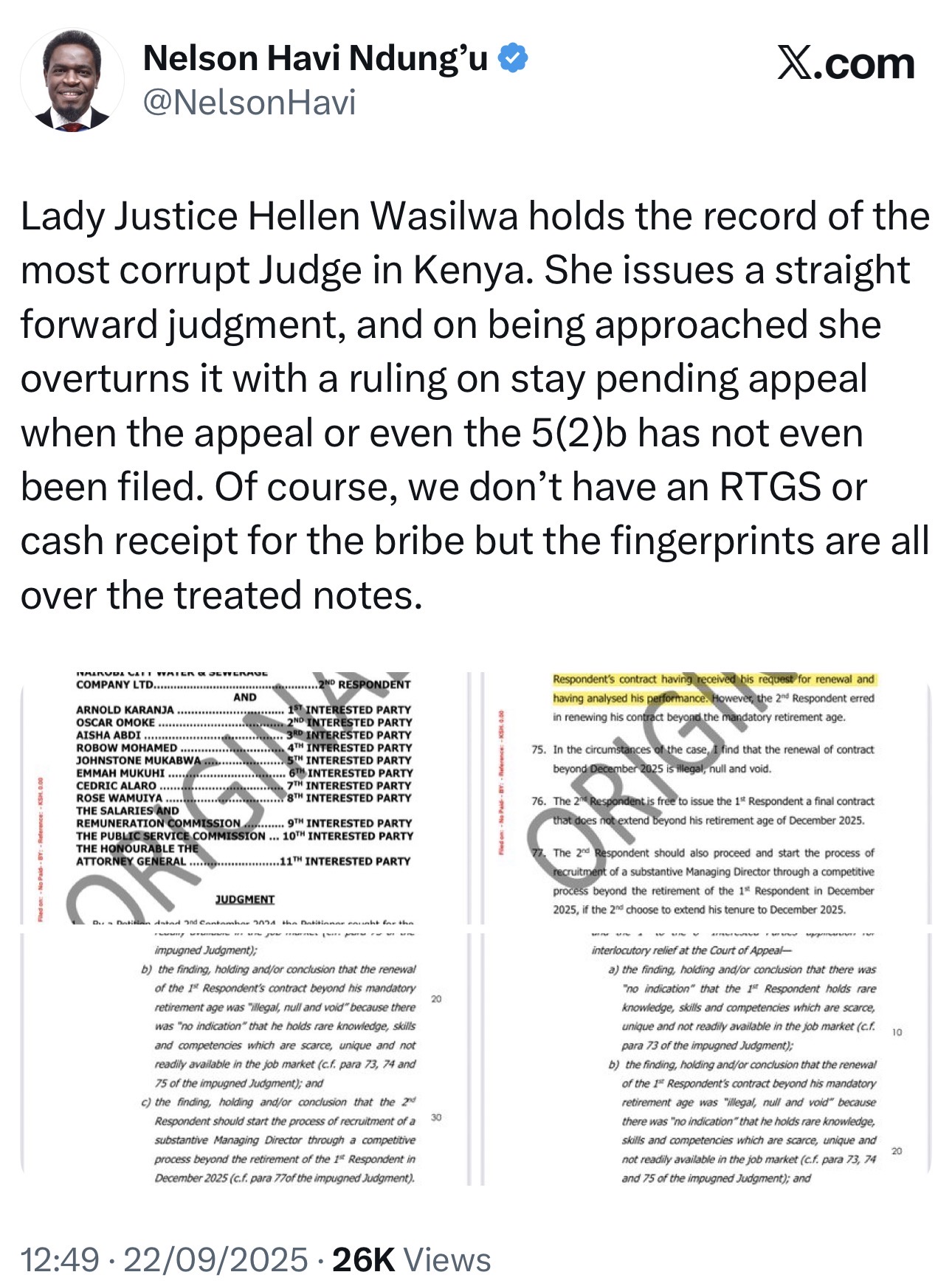 Justice Wasilwa has not responded to the new wave of attacks. In past affidavits, she has defended her record as fair and rooted in law, insisting that no judge should be punished for issuing unpopular decisions.