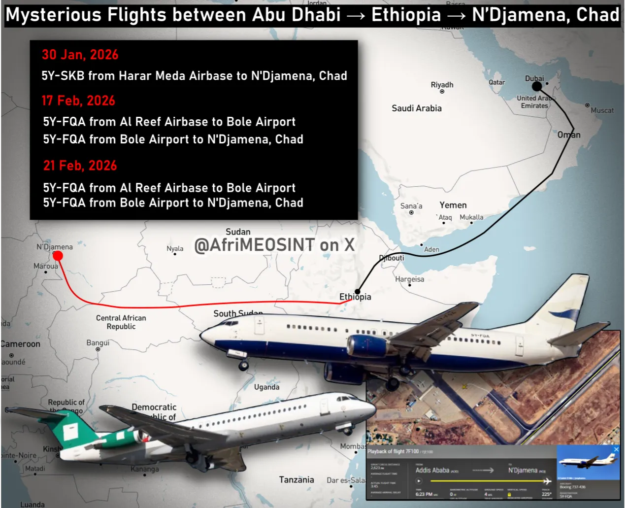 On three occasions in recent weeks, civilian-registered aircraft departed from Harar Meda Air Base and Bole International Airport in Ethiopia en route to N’Djamena International Airport in Chad.