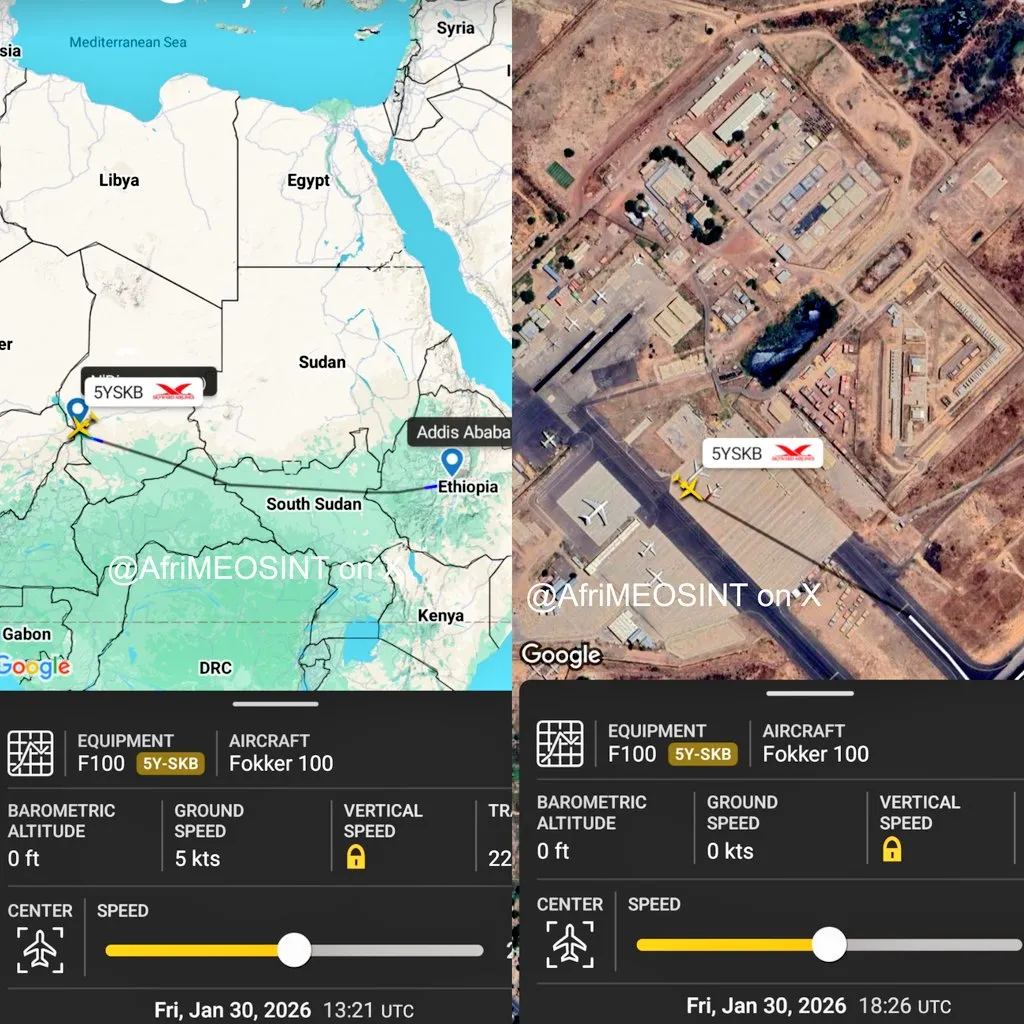 On January 30, another aircraft added to the pattern. A Fokker 100 registered 5Y-SKB and operated by Skyward Airlines flew from Harar Meda Air Base to N’Djamena, where it reportedly parked on the military apron. Aviation sources claim Skyward has previously transported injured RSF fighters, though the airline has not publicly addressed the allegation.