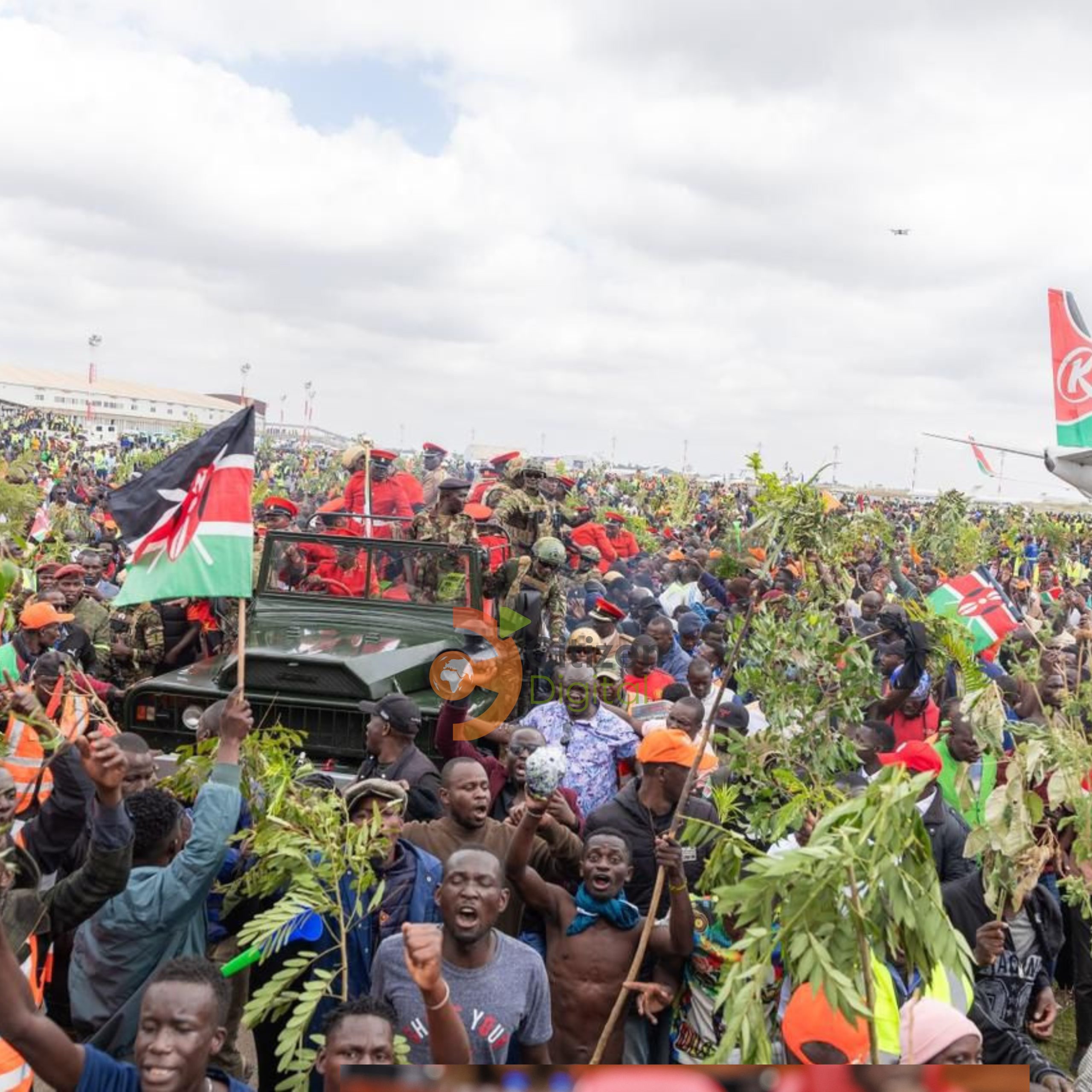 Homa Bay Governor Gladys Wanga told mourners at JKIA that the procession would use Mombasa Road instead of the Nairobi Expressway to allow Kenyans to pay their last respects, with hundreds of mourners escorting the body being carried on a gun carrier with the casket draped in a national flag.