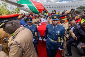 Homa Bay Governor Gladys Wanga told mourners at JKIA that the procession would use Mombasa Road instead of the Nairobi Expressway to allow Kenyans to pay their last respects, with hundreds of mourners escorting the body being carried on a gun carrier with the casket draped in a national flag.